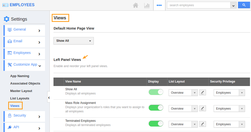 - Now, you can see all the views that you enabled using Configuration in the left panel of the Employees App home page.