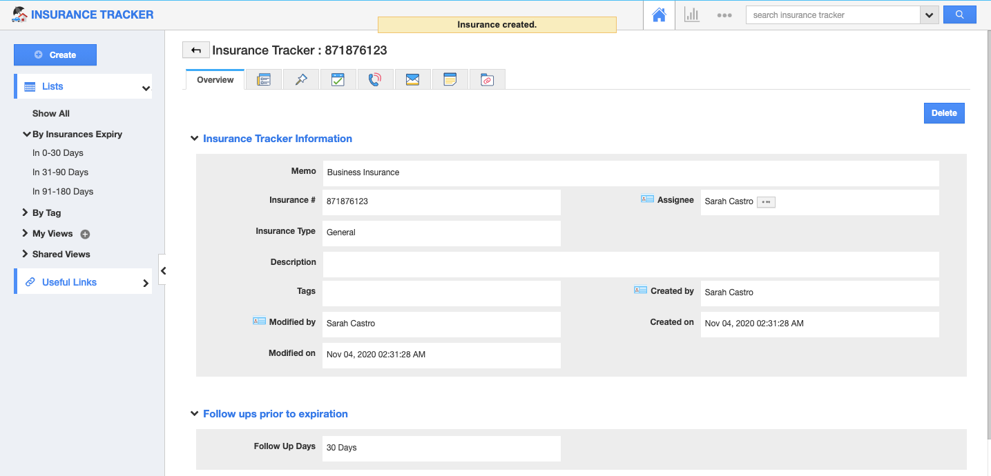 - The Email Feed is enabled to receive email notifications when the insurance tracker is Created and Modified.