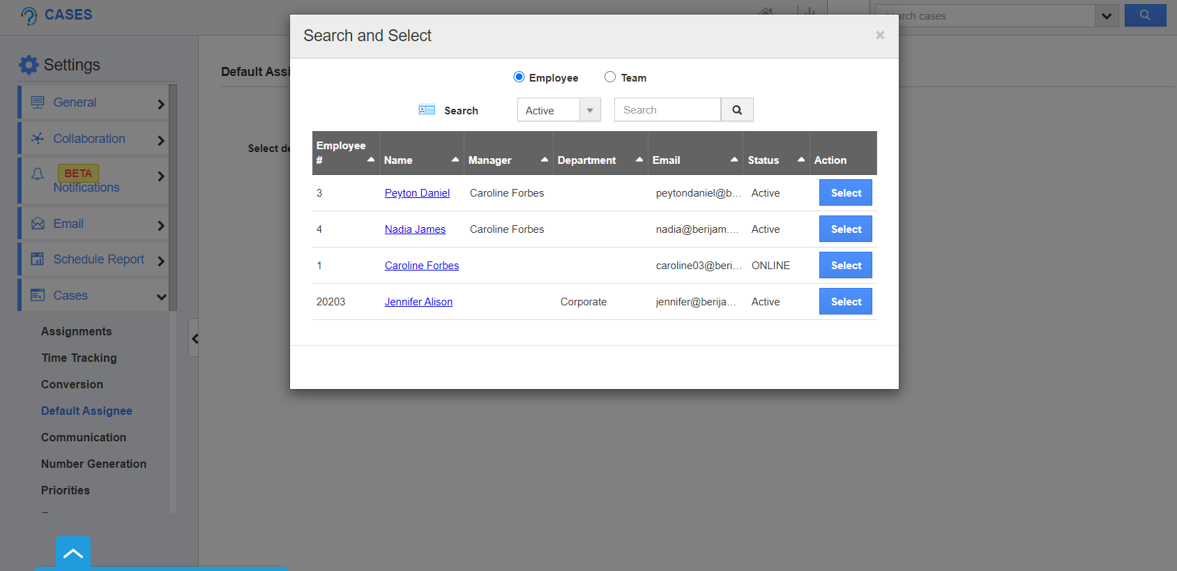 - Search and Select popup will come into view. Here, you can choose an employee or a team as a default assignee.