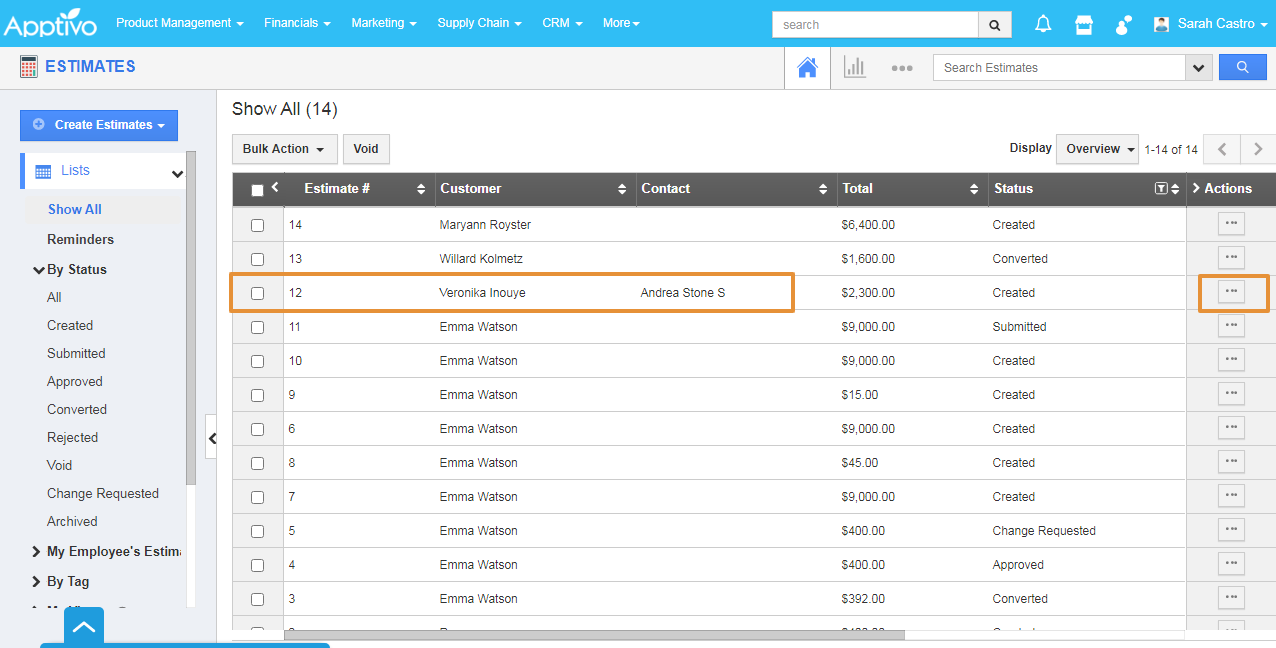 You can delete an estimate if you are no longer dealing with a prospect. Use the Delete option given in the Estimates overview page to delete the record.