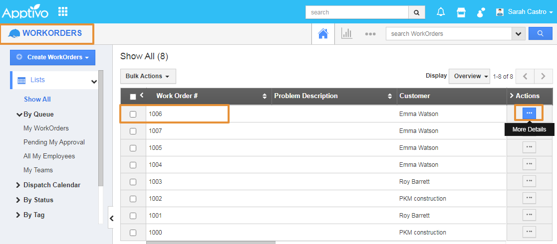 Work orders App allows you to print your work order information using the Print PDF option on the overview page.