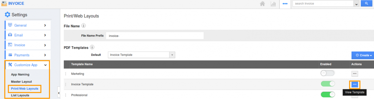- Click on "Customize App" dropdown and select "Print/Web Layouts" from left navigation panel.