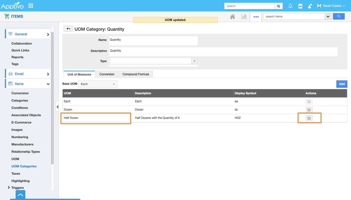 - Now, edit any item's information using the "Edit" button on the Item view page and select the newly created Primary UOM for the UOM category "Quantity".