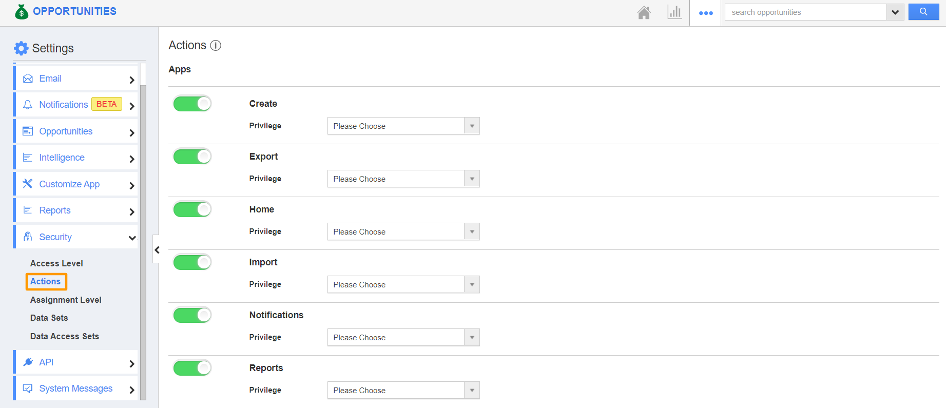 Opportunities app allows you to provide access to the users who are deputed to view “Reports” in the opportunities system. The users who have the privilege of reports access can use the “Reports” button found in the app header bar of the Opportunities app.