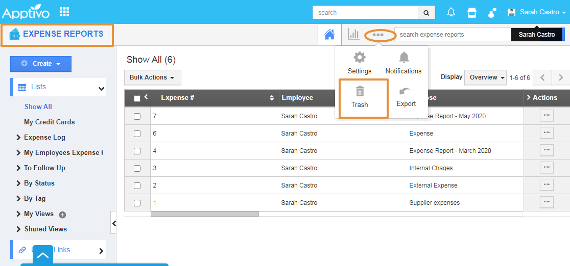 Expense Reports app allows you to view the deleted Expense Reports using an option called Trash. If you want to restore the deleted records/reports that too is possible. All that you need to do is click on the option called Restore.