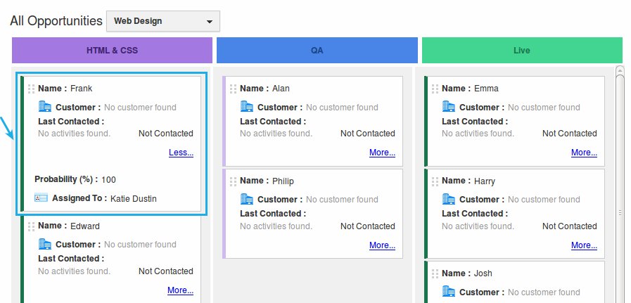 For instance: Consider a Sales Manager (Katie Dustin), who wants to view the “Name”, “Customer” & “Last Contacted” in the Default Kanban section and the fields “Probability(%)”, “Assigned To” in the Additional Field Detailed Kanban section.