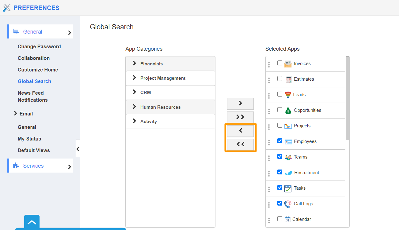 - The Preferences page will appear. Select Global Search from the left panel. The list of apps added to your account will be shown in the Selected Apps section of the Global Search page.