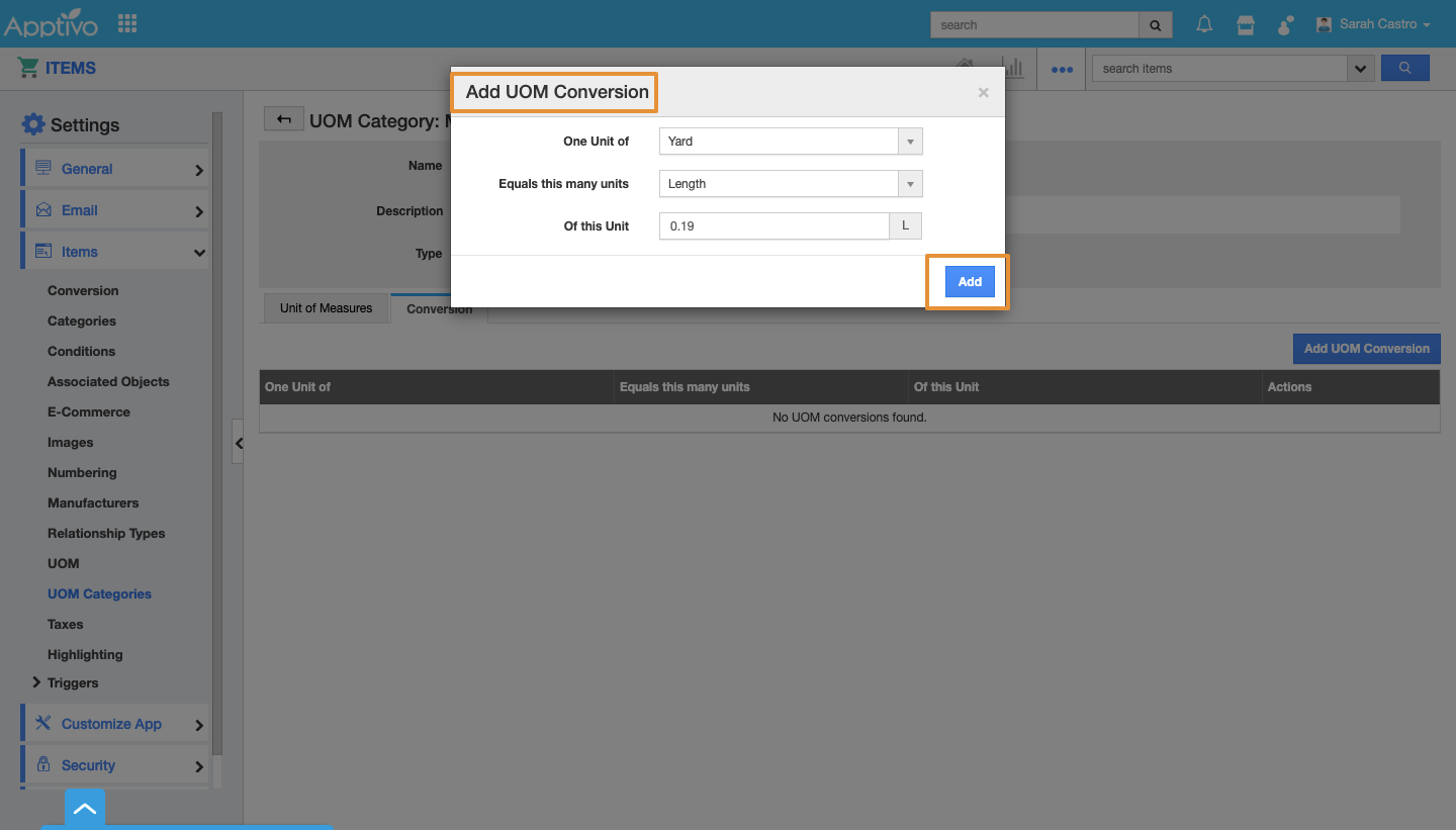 Apptivo Items App provides you with the opportunity of configuring UOM Categories. You can create your UOM and add a formula, conversion for those UOM. Follow the steps below to configure the UOM Categories.