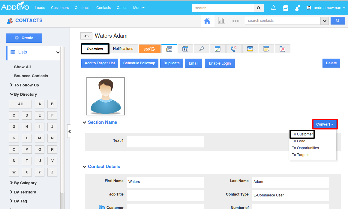 - Choose a Contact that you want to convert to Customer, click on the Convert in the Contact Overview page and select To Customers.
