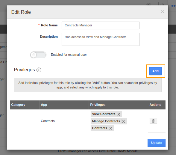 - You will be re-directed to the Add Privilege page. Select a particular department to add Privileges for that department. Here, I have added a Privilege to Modify in CRM → Contracts and saved it.