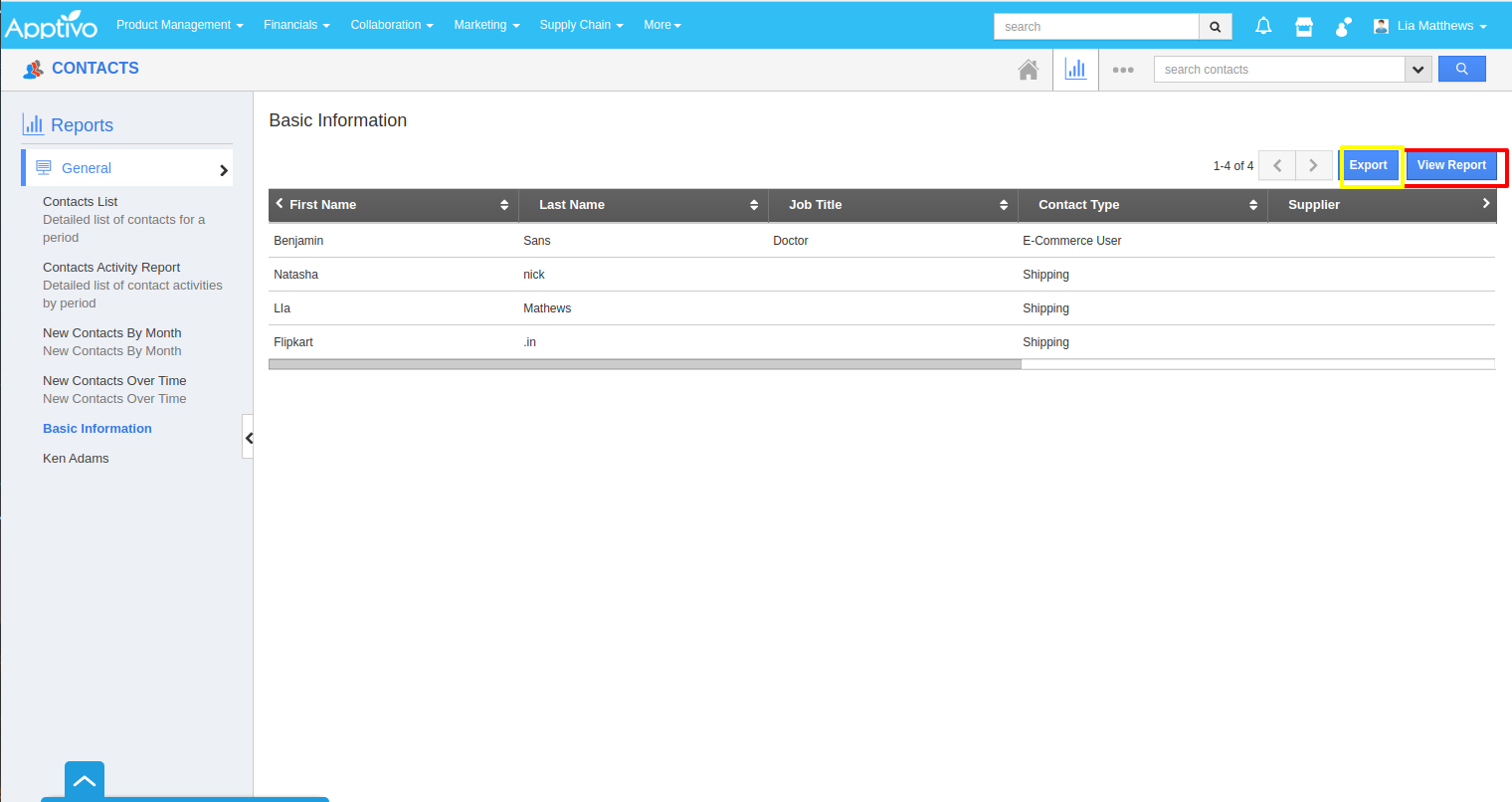 The contacts app allows you to create General reports by letting you easily fetch the required information from all other records of the contacts app. You can Insert attribute and get the information for which you wish to generate a report. You can also export the report by downloading it in .csv format.