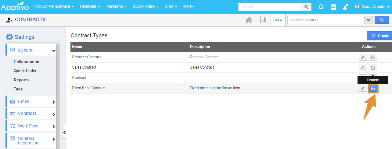 - You can Disable the Contract Type by clicking on the Disable icon.