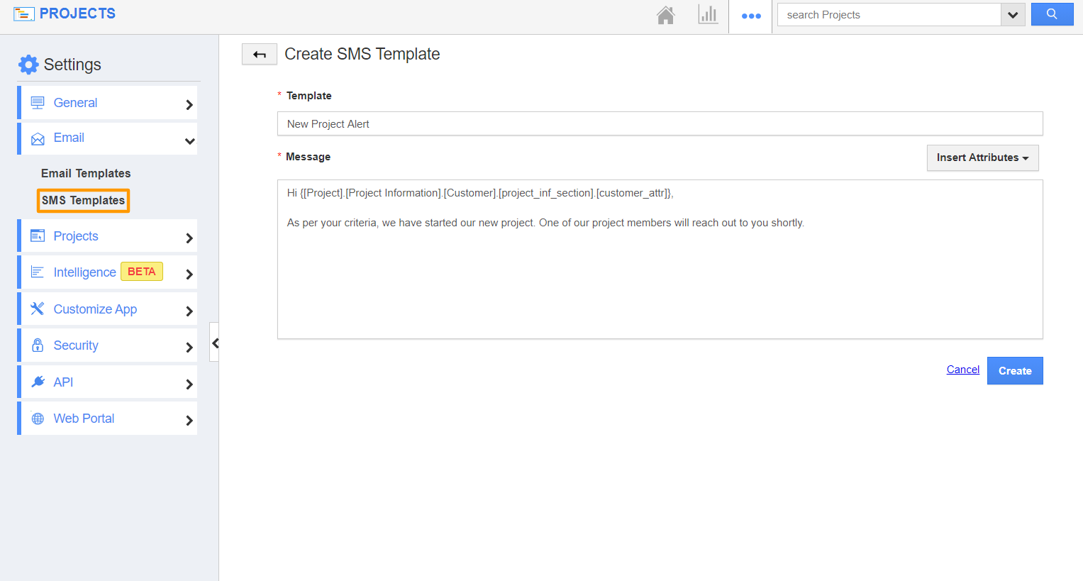 - Along with this, you can add the SMS message. You can make use of the Insert Attribute option to link fields in the Projects App with the SMS template. By doing so, the value of the corresponding field will be added automatically for the project while sending SMS.