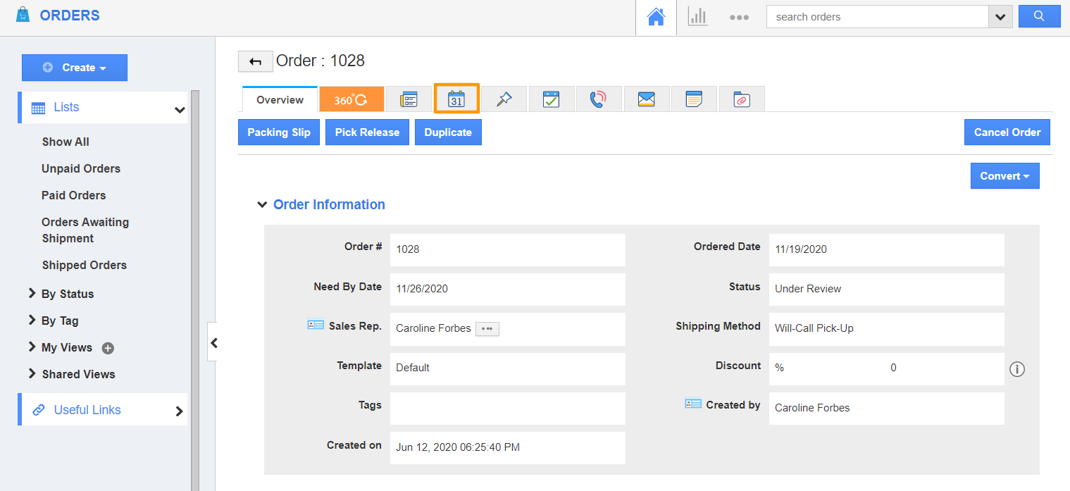 The Orders App of Apptivo enables you to create events with the information available on the overview page of an order. You can easily map the values present in these fields with the fields present in the calendar.
