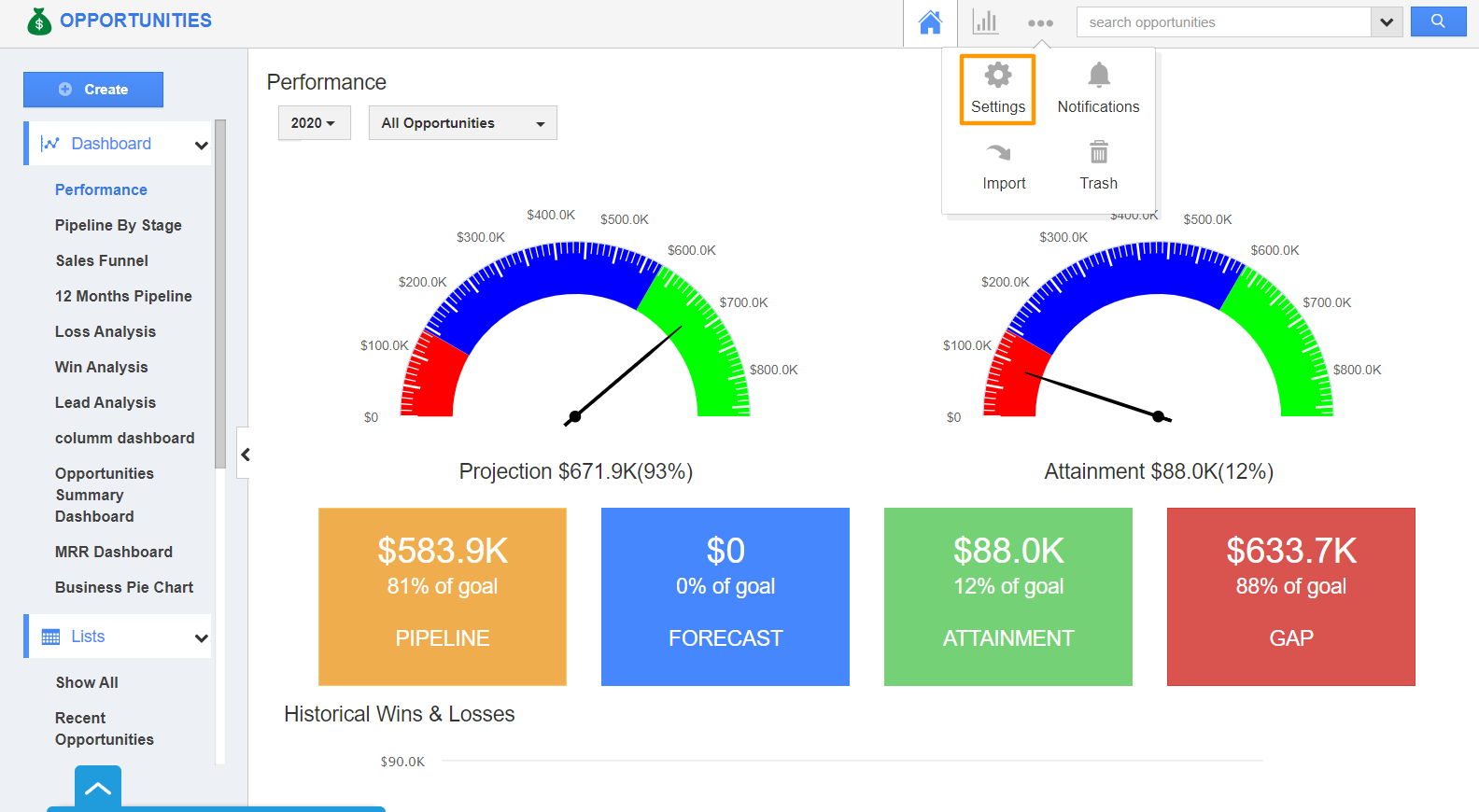 - Connect to your Apptivo account and navigate to the Opportunities App. Here, select Settings from the App Header.