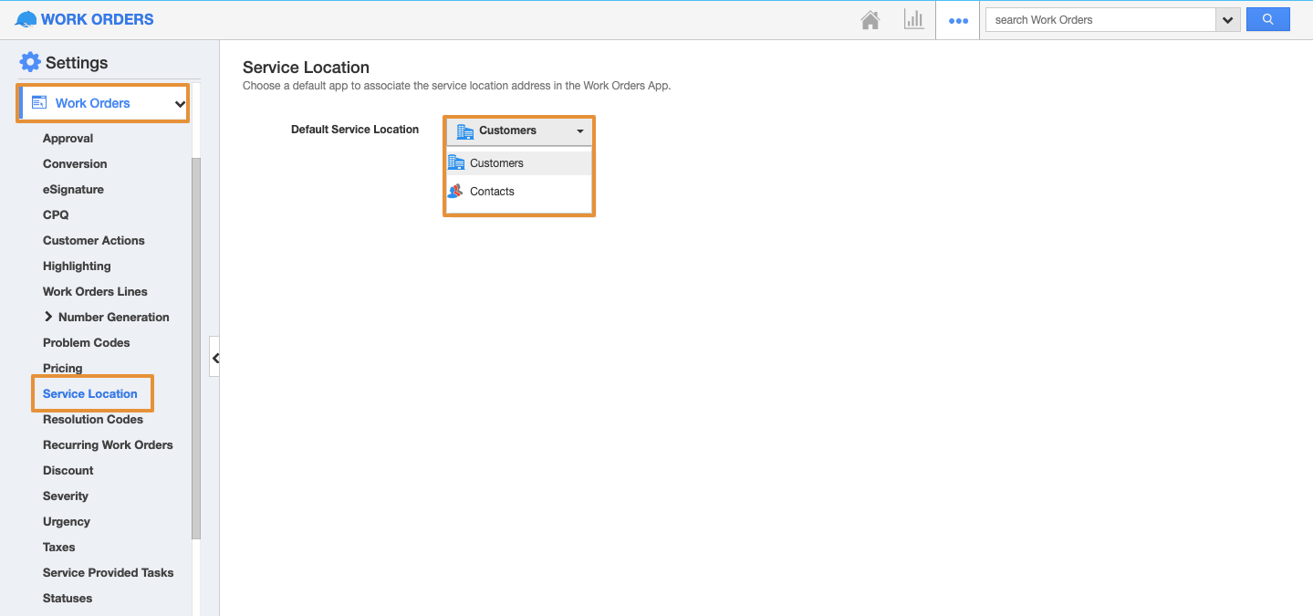 - From the Settings page, click on the Work Orders and select the Service Location.