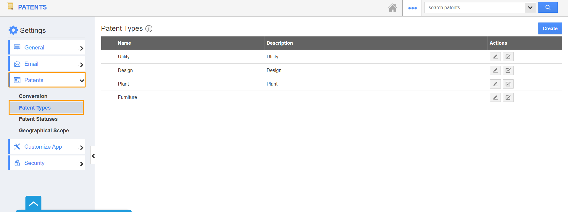 - Click on the Create button to create a new Patent Type.