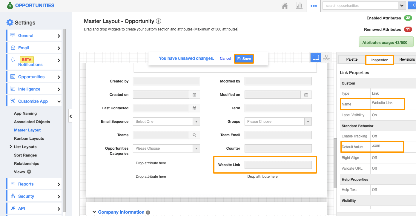 Follow the steps listed here to configure Link Attribute. (For instance - We will configure Link Attribute in Opportunities App)