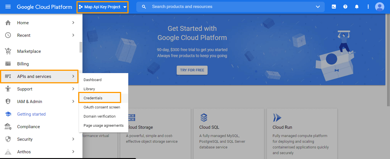 - From the Project dashboard, click on the API & Services from the left hamburger menu and select Credentials.