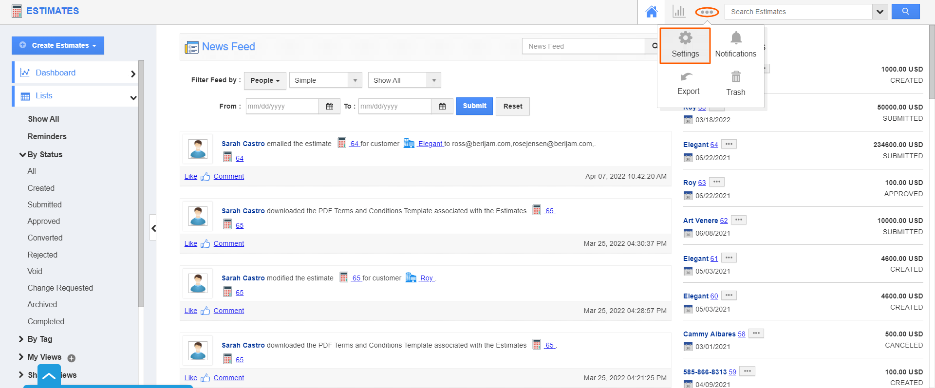- Log in and access the Estimates app from the universal navigation menu bar.