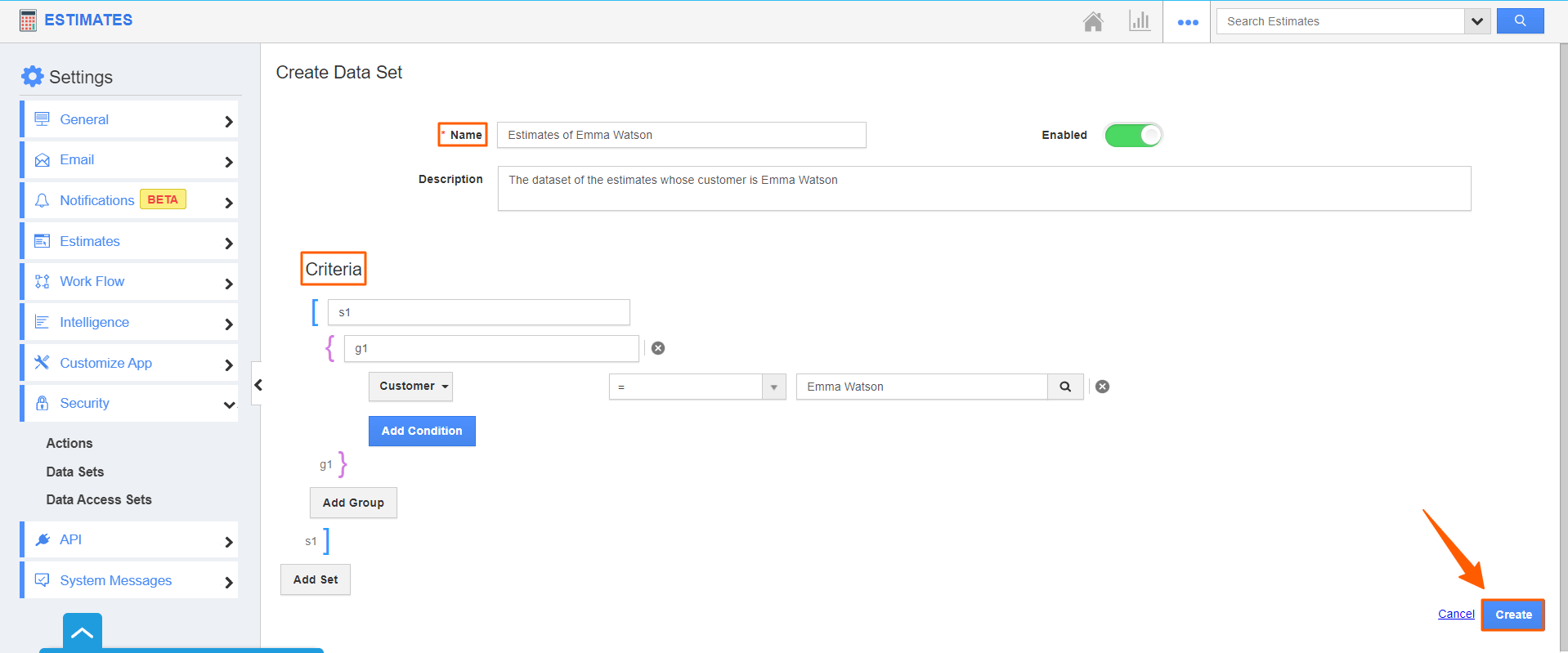 - The Criteria is the space where you can define the condition. Here, the criteria are set as “Customer = Emma Watson”. This specifies all the estimates when the customer is Emma Watson will be grouped as a set.