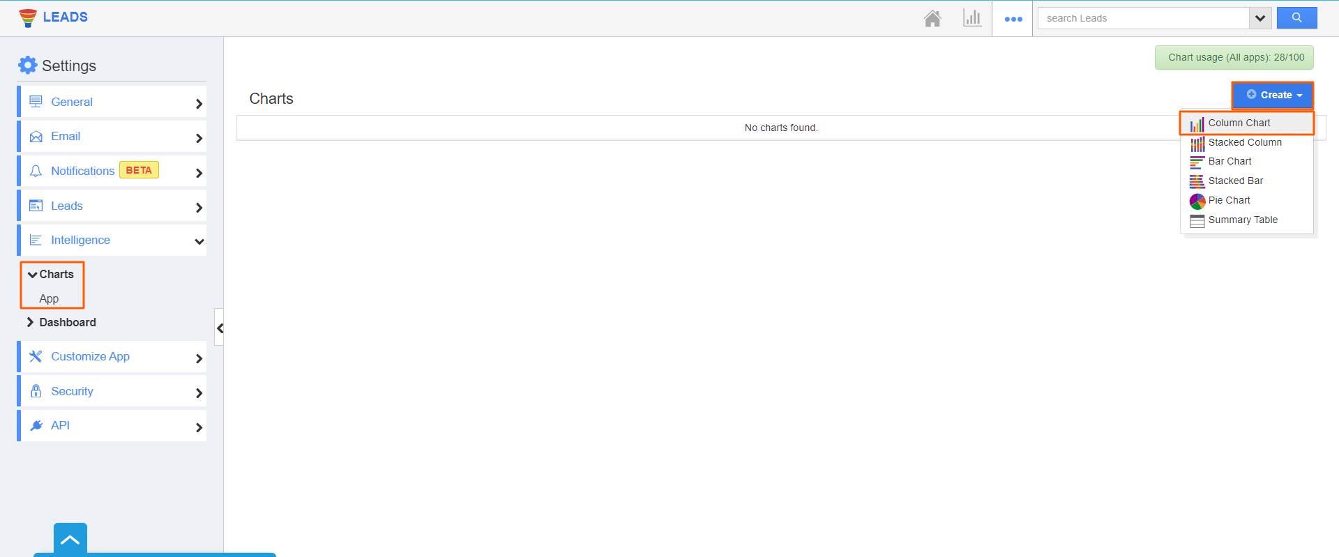 Note: Based on the Selected Privileges of the Leads app, the employee will have access to the Charts.