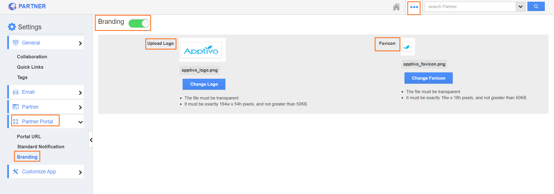 - Additionally, you can brand your Organization on the Portal by adding your company's Logo. To configure, go to "Branding" option under the partner portal drill down, Enable the toggle, and follow the uploading rules to upload your company's logo and favicon. This branding will appear across all the portal screens like Signup, Login, Homepage & Email Templates.