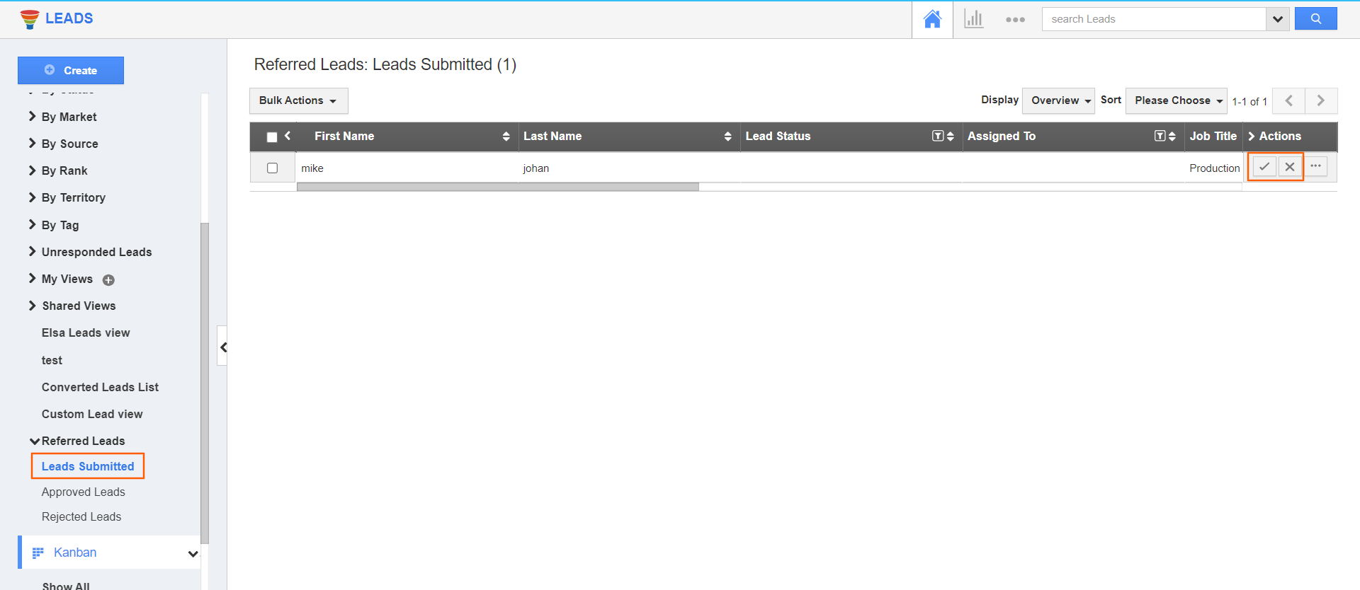 - In this particular view, the administrator has included the option to either approve or reject the submitted leads. The "Tick" button denotes approval for the submitted lead, whereas the "X" mark button signifies rejection of the submitted lead.